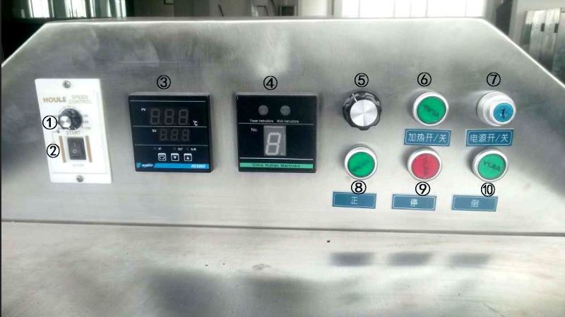 電磁炒貨機(jī)是一種電磁感應(yīng)加熱、智能自動(dòng)控制的炒貨設(shè)備。它與家用電磁爐工作原理相接近。 具有高效節(jié)能、綠色環(huán)保、智能控制、操作簡(jiǎn)便、合理耐用五大特點(diǎn)。 許多客戶在剛買(mǎi)到設(shè)備時(shí),看到操作面板上的各種開(kāi)關(guān)按紐,不免會(huì)有些不知所措。 下面我們就以許昌智工生產(chǎn)的DCCZ5-5電磁炒貨機(jī)為例介紹一下: 我們先來(lái)看一下DCCZ5-5的操作面板圖片: 那么,這些開(kāi)關(guān)按紐分別都有什么作用呢? ①、調(diào)速器旋鈕(正面白色):用于調(diào)節(jié)炒鍋轉(zhuǎn)速,順時(shí)針調(diào)節(jié)加速,逆時(shí)針調(diào)節(jié)減速,可根據(jù)炒制品特性,適當(dāng)調(diào)整。 ②、調(diào)速器開(kāi)關(guān)(正面黑色):調(diào)速器的電源開(kāi)關(guān),按下此開(kāi)關(guān)上端,調(diào)速器通電,按下此開(kāi)關(guān)下端,調(diào)速器斷電,(注:調(diào)速器斷電時(shí),炒鍋不轉(zhuǎn)動(dòng)) ③、溫控器(正面黑色):PV顯示炒鍋內(nèi)的實(shí)時(shí)溫度,SV顯示預(yù)設(shè)定的需求溫度。按一下左下角的鍵可設(shè)置需求溫度,向上向下按鍵可以對(duì)數(shù)值進(jìn)行增加或減少,設(shè)置好后,再按一下左下角的鍵確認(rèn)并退出設(shè)置。當(dāng)PV值低于SV值時(shí),正常加熱;當(dāng)PV值等于SV值時(shí),自動(dòng)停止加熱并報(bào)警;當(dāng)PV值再次低于SV值時(shí),自動(dòng)開(kāi)始加熱,就這樣循環(huán)加熱,達(dá)到恒溫目的。 ④、加熱檔位顯示器(正面黑色):顯示加熱的檔位,可依次分別顯示“一”、“1”、“2”、“3”、“4”、“5”,顯示“一”時(shí)不加熱,檔位越高,功率越大,加熱越快。 ⑤、加熱檔位調(diào)節(jié)旋鈕(正面白色):用于調(diào)節(jié)加熱檔位,順時(shí)針調(diào)節(jié)加大檔位,逆時(shí)針調(diào)節(jié)減小檔位。 ⑥、“加熱開(kāi)/關(guān)”(正面綠色):炒貨機(jī)加熱開(kāi)關(guān)按鈕,按一下燈亮?xí)r開(kāi)始加熱,再按一下燈滅時(shí)停止加熱。炒貨前一般需要先預(yù)加熱。 ⑦、“電源開(kāi)/關(guān)”(正面藍(lán)色):炒貨機(jī)電源總開(kāi)關(guān),鎖孔垂直時(shí)為關(guān)機(jī)狀態(tài),鎖孔水平時(shí)為開(kāi)機(jī)狀態(tài)。 ⑧、“正”(正面綠色):炒鍋?lái)槙r(shí)針轉(zhuǎn)動(dòng)按鈕,按下 此按鈕,指示燈亮,炒鍋?lái)槙r(shí)針轉(zhuǎn)動(dòng)。此時(shí)可以上料開(kāi)始炒貨。 ⑨、“!保ㄕ婕t色):停止炒貨按鈕。出貨前,應(yīng)先按下此按鈕,指示燈亮,炒鍋停止轉(zhuǎn)動(dòng)。 ⑩、“倒”(正面綠色):炒鍋逆時(shí)針轉(zhuǎn)動(dòng)按鈕,按下此按鈕,指示燈亮,炒鍋逆時(shí)針轉(zhuǎn)動(dòng),此時(shí)可自動(dòng)出料,炒貨結(jié)束。